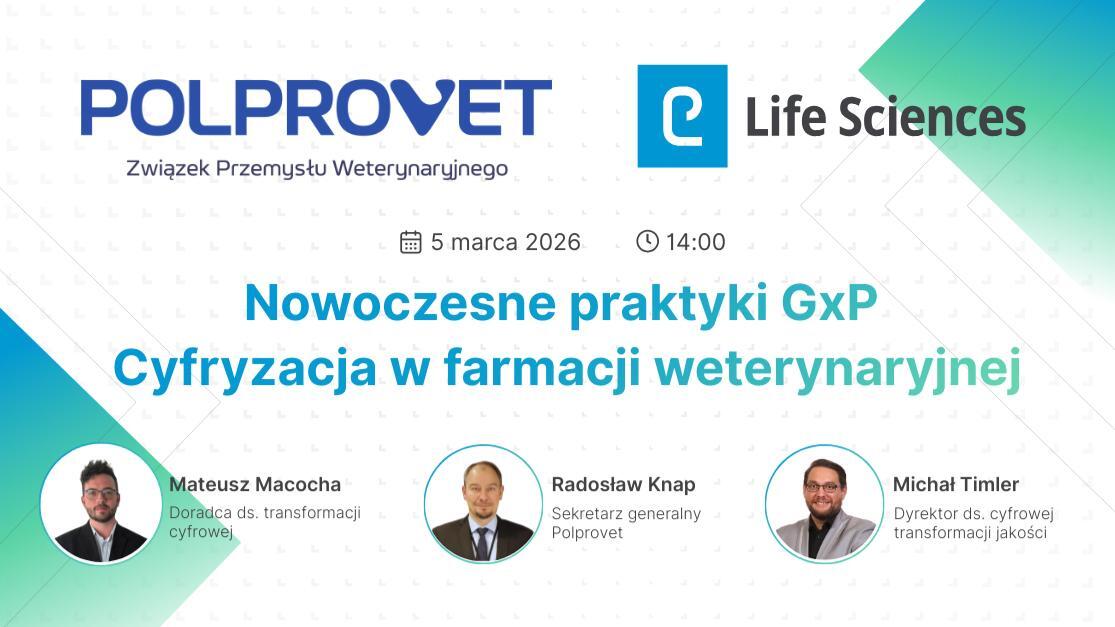 Zapraszamy Państwa na spotkanie online, podczas którego porozmawiamy o tym, jak zmienia się podejście do zgodności regulacyjnej w sektorze weterynaryjnym oraz jaką rolę odgrywa w tym cyfryzacja procesów jakościowych.